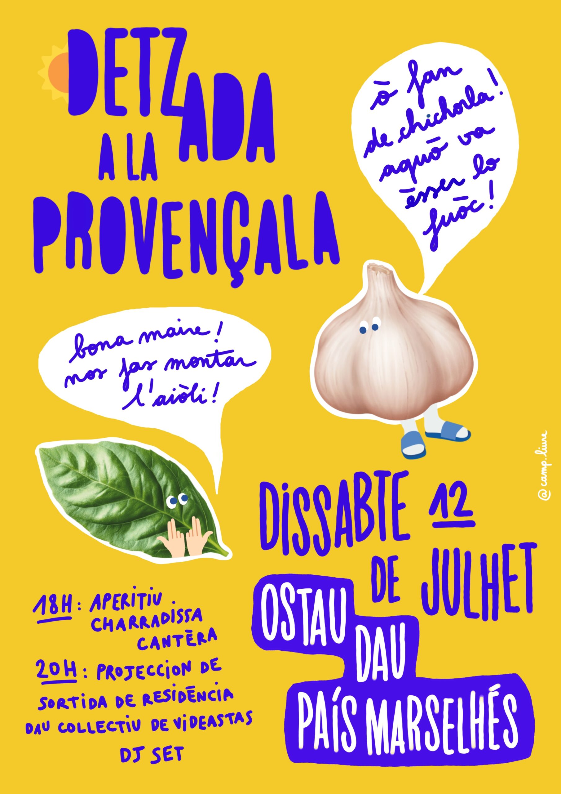 Realizacion d’una aficha per la sortida de residencia de Dètz a l’Ostau dau País Marselhés en julhet de 2025 + extraches de GIF animats realizats pendent la detzada.