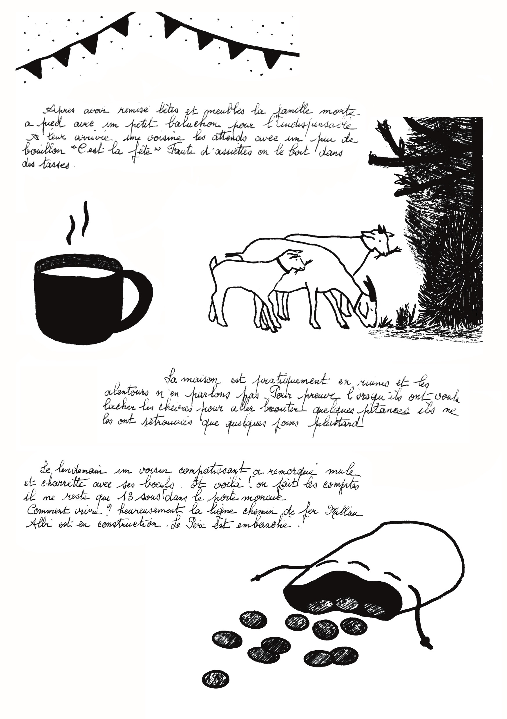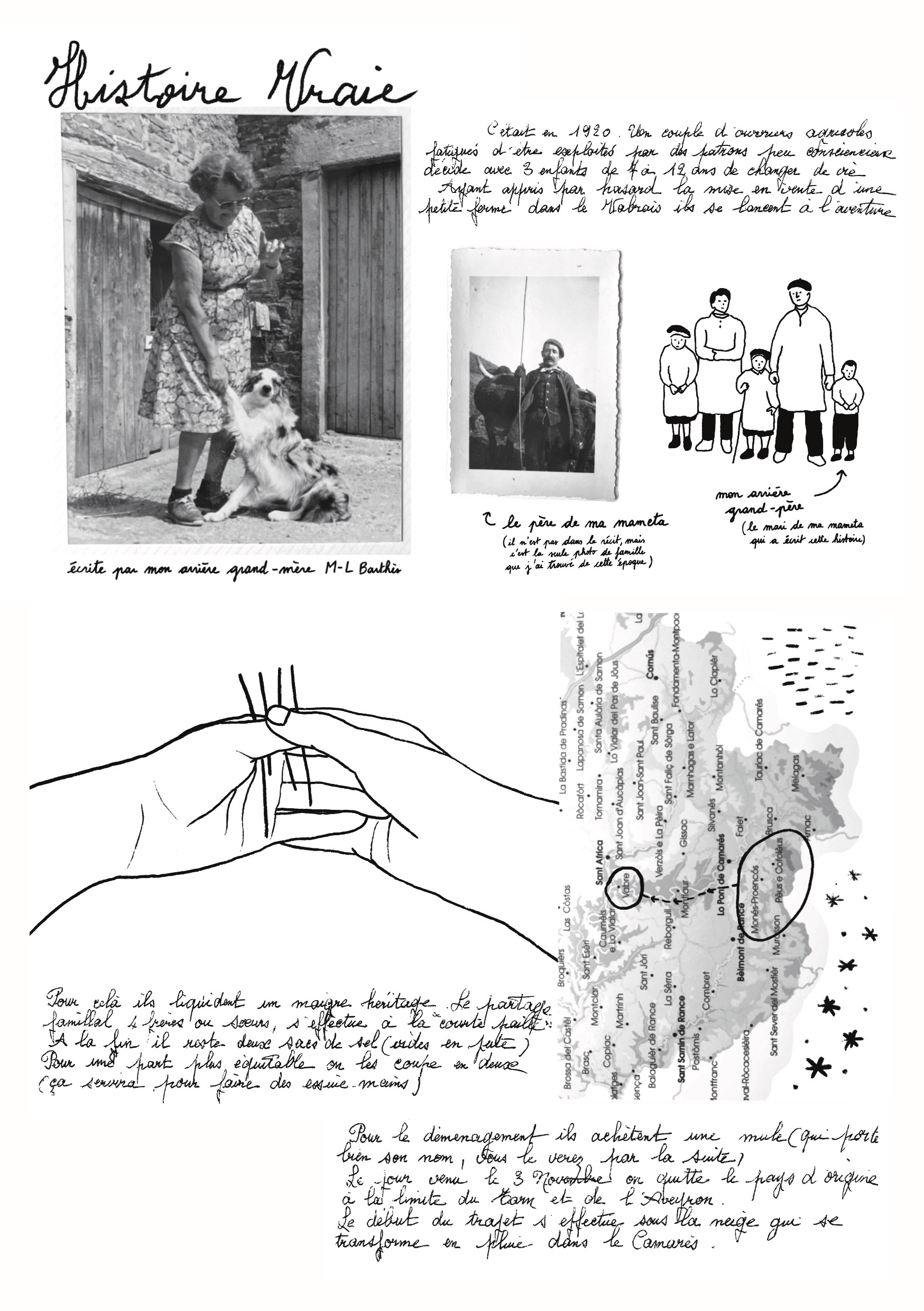 La rèiregrand Marineta nos a daissat un tresaur que ten sus una pagina rectò-versò : lo relat de la migracion de ma familha al mes de novembre de 1920, dels pès dels Monts de Lacaune fins a Vabres de l’Abadiá. La cèrca d’un avenir melhor se revela semenada de trabucs. Un sègle mai tard, la familha demòra totjorn en naut d’aqueste puèg Vabres. Per la memòria, illustri lo relat e lo partegi al mond a travèrs mon ecran de telefonet. Se los temps an plan cambiat, la misèria ela, totjorn se fugís.